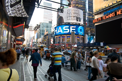 Times Squares blinkande neonskyltar och enorma tv-skärmar som pumpar ut reklam har blivit en symbol för New York och dess intensiva storstadspuls. Här blandas restuaranger och Casinon med biografer och teatersalonger.